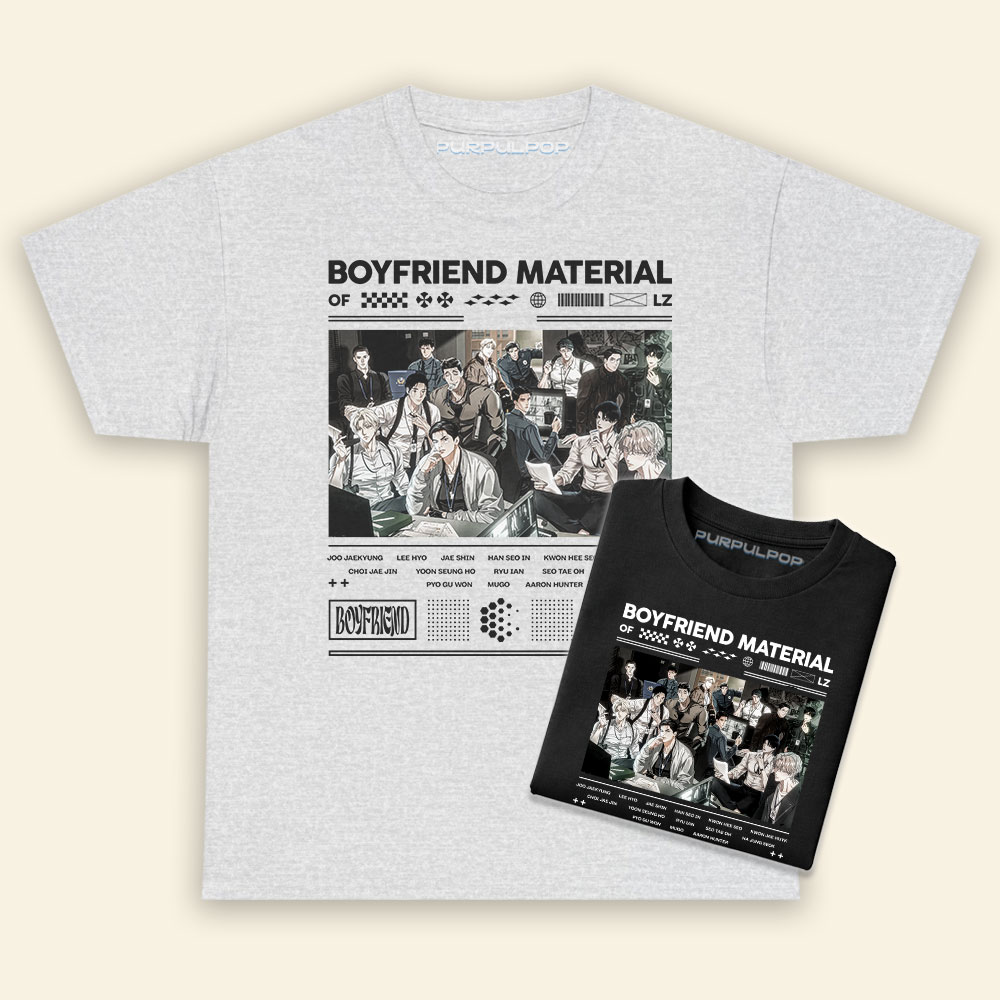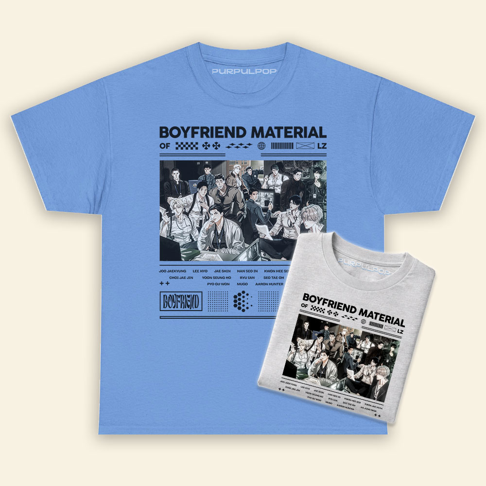 Boyfriend Material LZ Manhwa BL ShirtMaterial: Medium-heavy fabric (8.0 oz/yd² (271.25 g/m²)). 50% cotton, 50% polyester.
