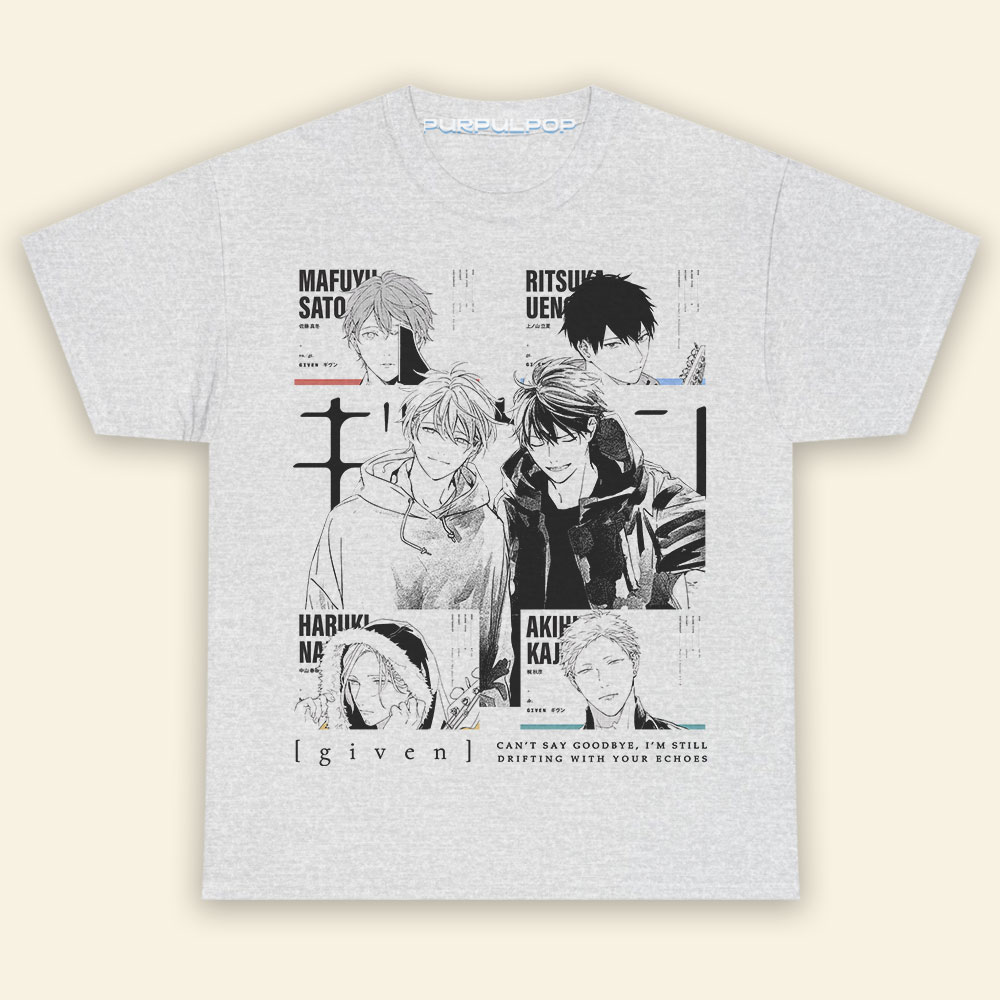 Given Ritsuka Mafuyu Haruki Akihiko Manga ShirtMaterial: Medium-heavy fabric (8.0 oz/yd² (271.25 g/m²)). 50% cotton, 50% polyester.